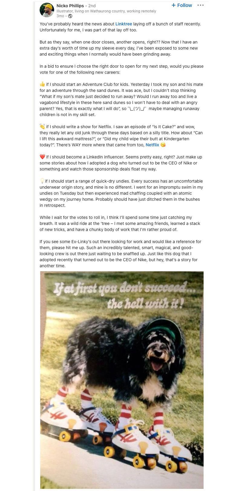 When the platforms we use to communicate with one another favour certain types of stories, it’s understandable we end up telling them ourselves; no one ever got a job by posting about how it sucks to keep getting fired. But is it possible to play the game without showing your whole arse? I have seen people try. This post, which the editors of the magazine you are currently reading have asked me to include in this article, comes the closest I’ve seen to skewering the Positive Layoff Post while still advertising the fact that the poster has been laid off and needs work: